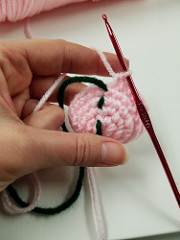 I have two things working against me when it comes to making amigurami. I’m easily distracted and I can’t count, so I learned (the hard way) that I not only need to use a traditional stitch marker, but I also need to mark the beginning of each round. I do this with a contrasting piece of yarn. This also makes in easier to keep track of the number of rows you’ve crocheted.
